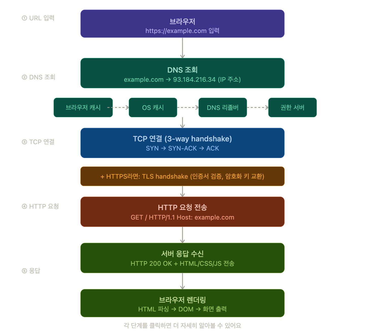 - DNS 조회 — 도메인을 IP 주소로 변환 (캐시 → OS → ISP → 루트 서버 순서로 찾음)