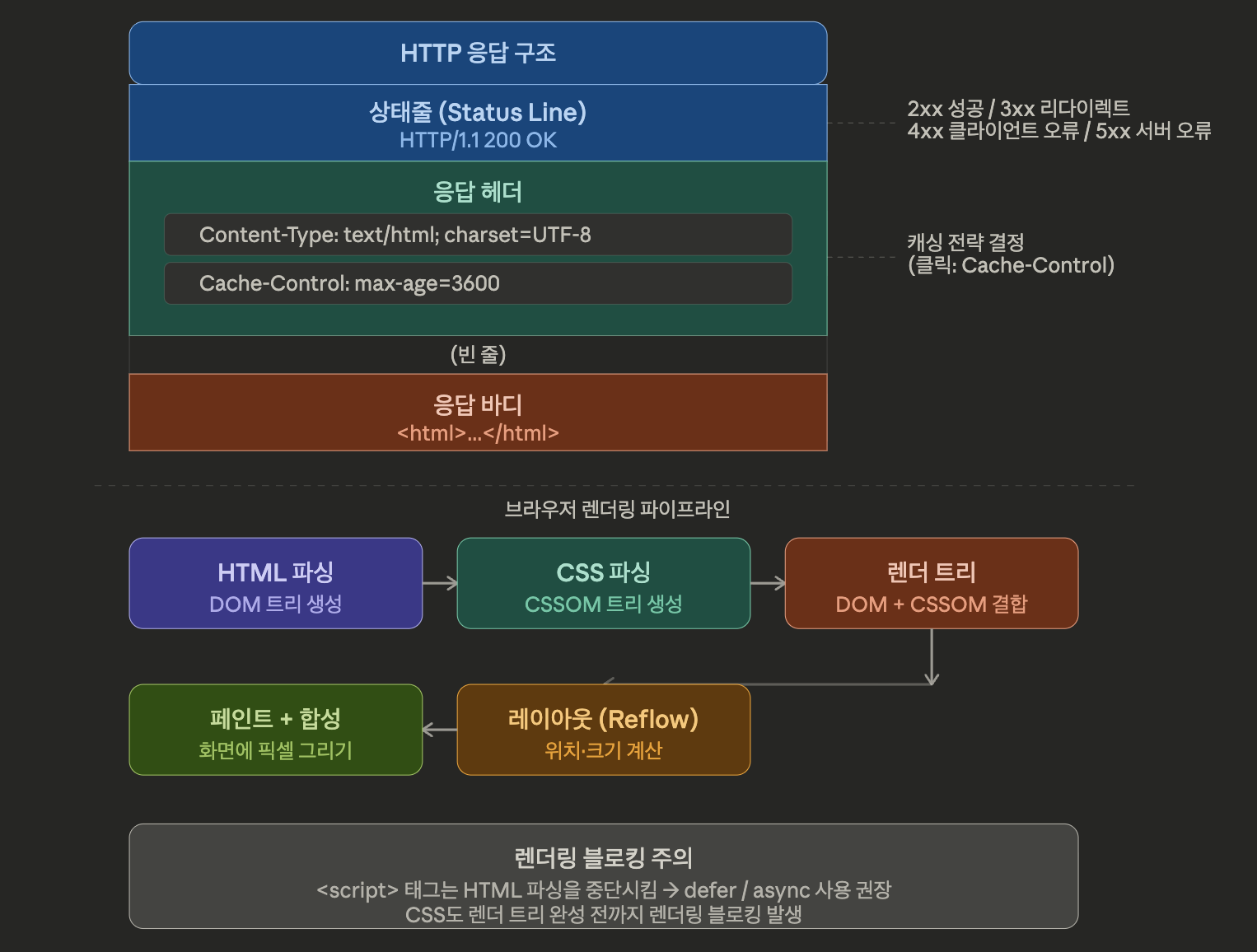 서버가 응답을 보내면 브라우저가 그걸 받아서 화면에 그리는 과정이에요.